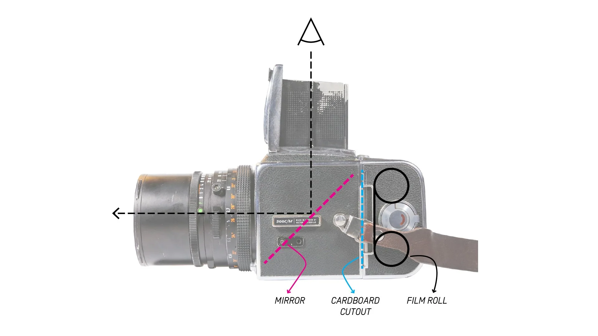Visual Description: Side elevation photo of the Hasselblad 500C/M camera, overlaid with a line drawing showing the location of the mirror, the cardboard cutout, and the filmroll; to illustrate that since the cardboard cutout is behind the mirror, it’s not visible through the viewfinder.