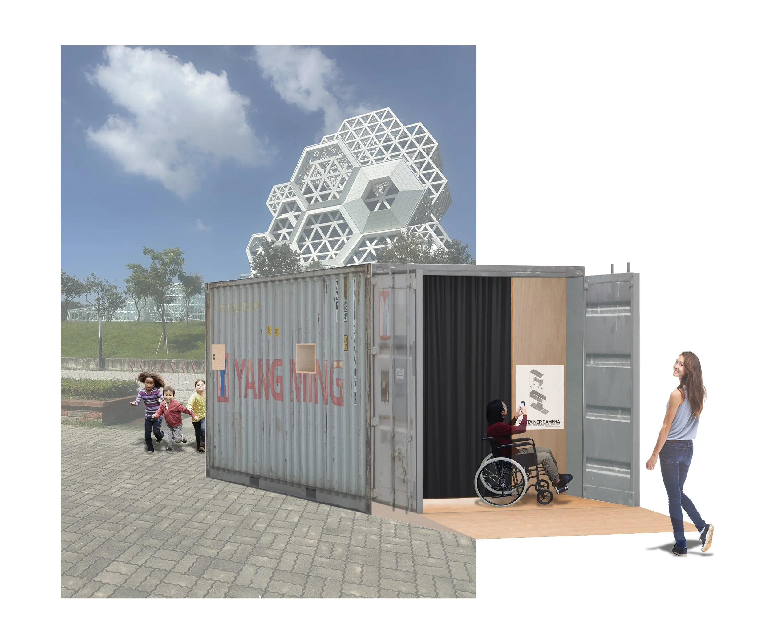 Exterior rendering collage of the Container Camera at the site, showing a person in a wheelchair up the entrance ramp, photographing the narrative mounted exteriorly explaining what the space is like. In the background Kaohsiung Music Center.