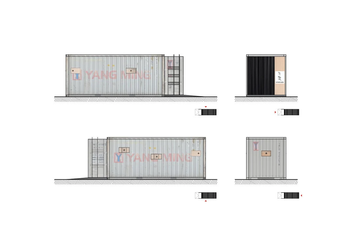 Elevations of the four exterior sides. The exterior is anticipated to be left as found. The only change is seeing the wood parts cut through the walls holding the lenses, which will entice the audience to find out more.