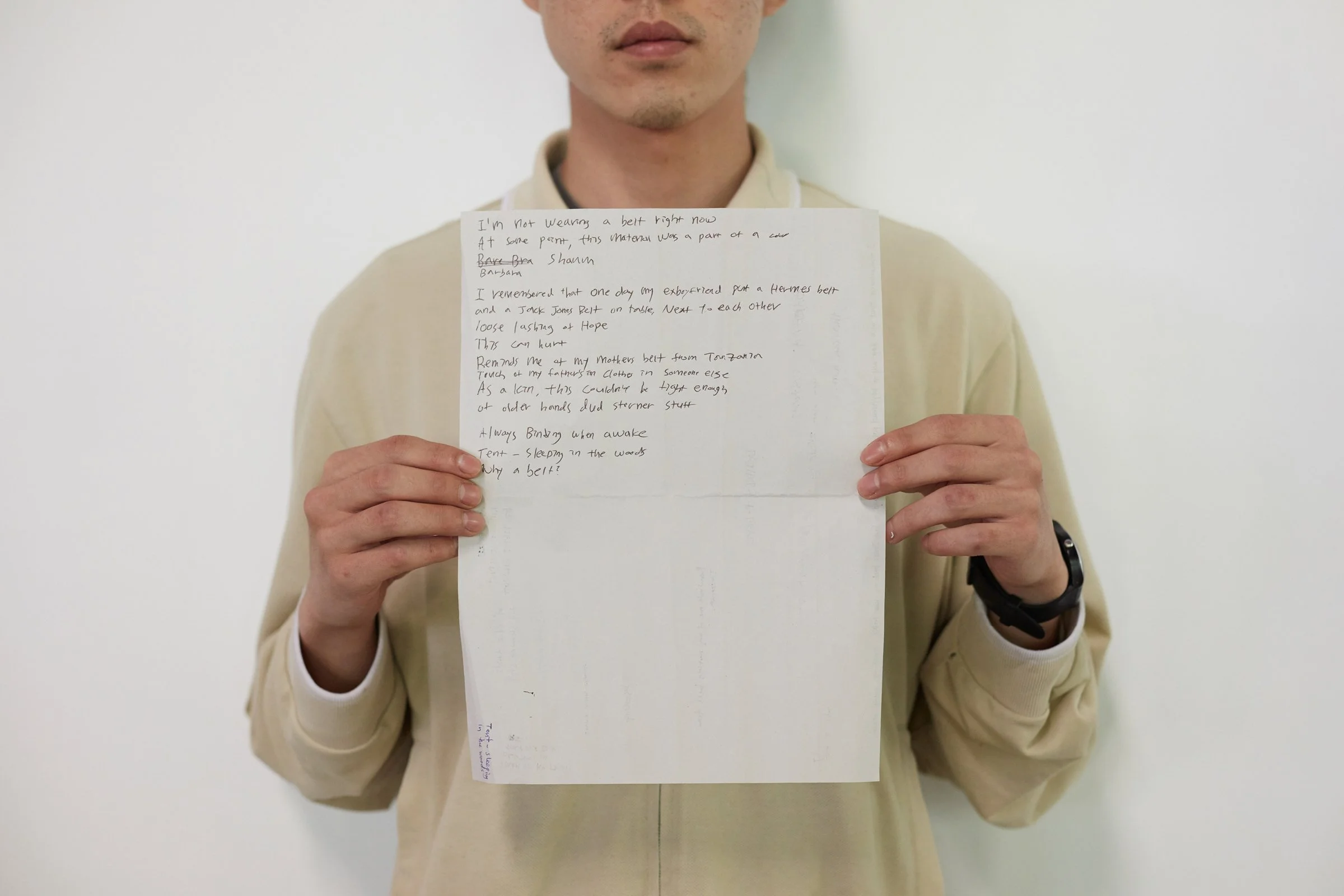 The torso of a body that appears masculine to me, holding a piece of paper with a poem handwritten on it reading: I’m not wearing a belt right now / At some point, this materias was a part of a color / [crossed out: Bare Bar] Barbara Shanm / I remembered that one day my exboyfriend put a Hermes belt / and Jack Jones Belt on table, Next to each other / loose lashing at Hope / This can hurt / Reminds me of me mothers belt from Tongdosa / Touch of my fater’s an clothes in someone else / As a kin, this couldn’t be tight enough / of older hands dud sterner stuff / Always Binding when awake / Tent - sleeping in the woods / Why a belt?