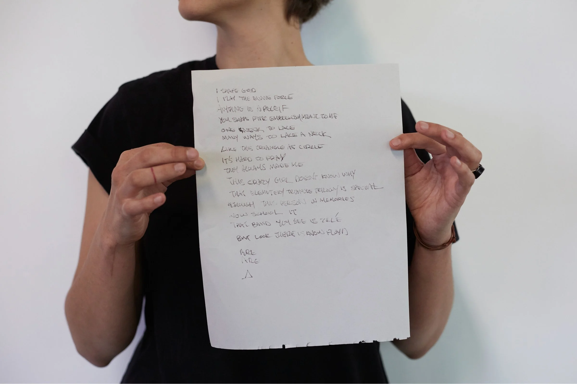 The torso of a body that appears femenine to me, holding a piece of paper with a poem handwritten on it reading: I SHAPE GOD / I PLAY THE DIVINE FORCE / ANYTHING IS A RELEIF / YOU SHARE PINK EMERGENCEMENT TO ME / ONE NECK TO LACE / MANY WAYS TO LACE A NECK / LIKE THIS TRIANGLE AS CIRCLE / IT’S HARD TO PRAY / THEY ALAWAYS MADE ME / THIS CRAZY GIRL DOESN’T LNOW WHY / THAT ELEMETERY TRIANGLE TRIOLOGY IS SPECIAL / ALTHOUGHT THIS PERSON IN MEMORIES / NOW SCHOOL IT / THAT CAND YOU SEE IS ZELE / BUT LOOK THERE IS NOW FLOYD / ARE / ARE / [DRAWING OF A RIGHTSIDED TRIANGLE]